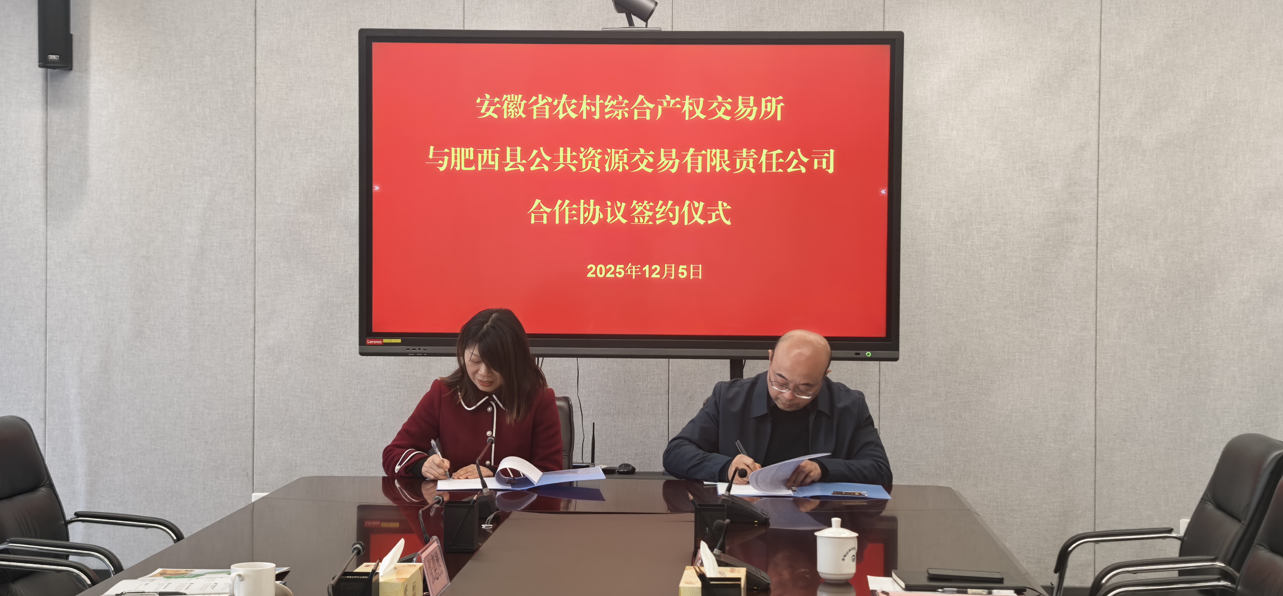 12月5日,安徽省农村综合产权交易所有限公司与肥西县公共资源交易有限责任公司战略合作框架协议签约仪式在金融港隆重举行。此次签约标志着双方正式建立长期稳定的战略合作伙伴关系,将携手推动肥西县农村产权交易市场高质量发展,为乡村振兴注入强劲动力。双方公司负责人参加本次签约仪式。